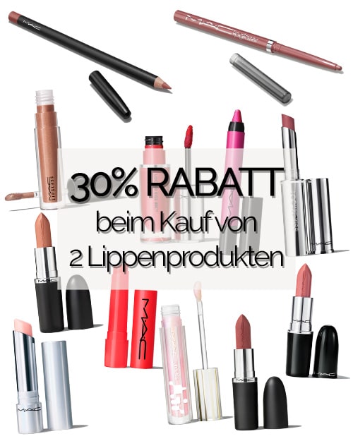 Bei MAC Cosmetics bekommst du aktuell 30% Rabatt auf Lippenprodukte beim Kauf von mindestens 2 Produkten.