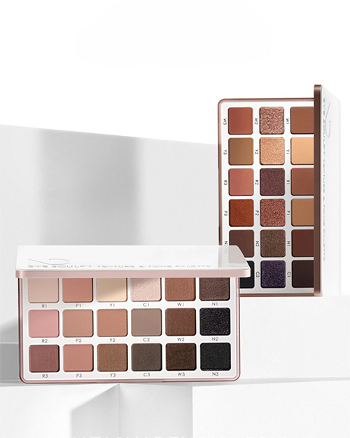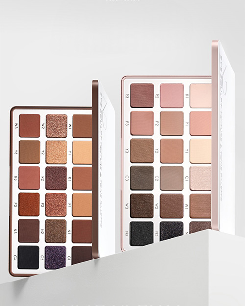 Jede der 18-Farb-Paletten ist so aufgebaut, dass jede vertikale Spalte einem anderen Unterton folgt, inspiriert vom HY-GLAM Concealer Undertone System, darunter Gelb-, Kalt-, Rosé-, Pfirsich-, Warm- und Neutraltöne.