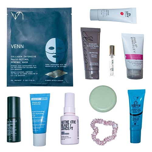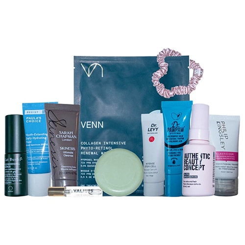 In der Box sind 11 Pflege-Essentials für Haut und Haar, davon 1 Originalprodukt und 10 Travel Sizes.